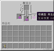 把酿造台放置好后,在酿造台的三个格子里放入地狱疣。接着,在最下面的格子里倒入水瓶,这样就开始酿造了。酿造出来的是粗制药水,这只是第一步哦。