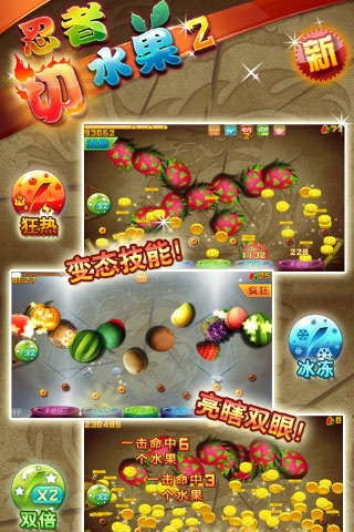 1. 玩家操控忍者在屏幕上滑动手指来切割水果,精准度越高得分越高。