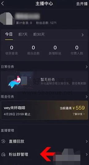 4. 管理粉丝群:在主播中心页面,找到“直播管理”板块,点击“粉丝群管理”。