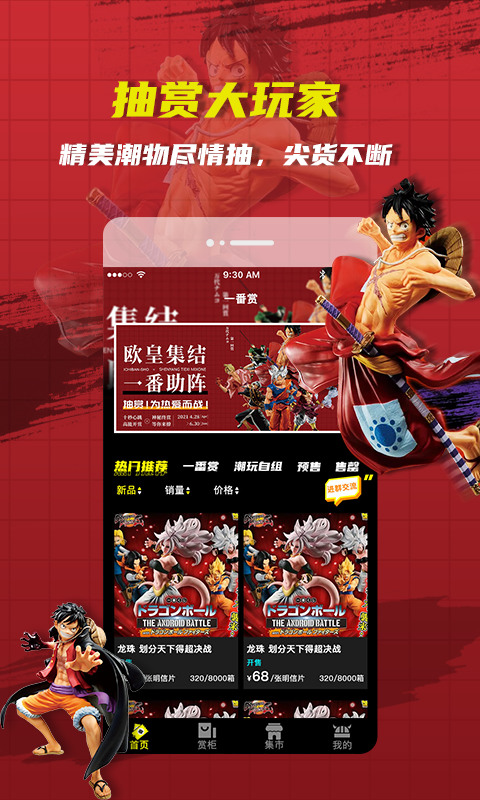绝世一番赏是一款备受瞩目的安卓软件,它为用户带来丰富多样的一番赏体验。软件内集合了各类热门动漫、游戏、影视等正版授权周边产品,以独特的抽奖形式供用户参与。丰富的奖池涵盖了从精美手办到限量珍藏品等众多诱人奖品,让粉丝们有机会将喜爱的角色周边带回家。界面设计简洁直观,方便用户轻松浏览和参与抽奖活动,是一番赏爱好者不容错过的宝藏软件。